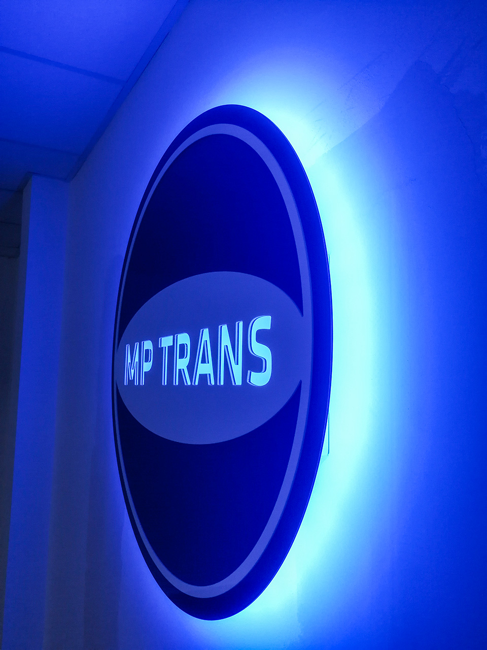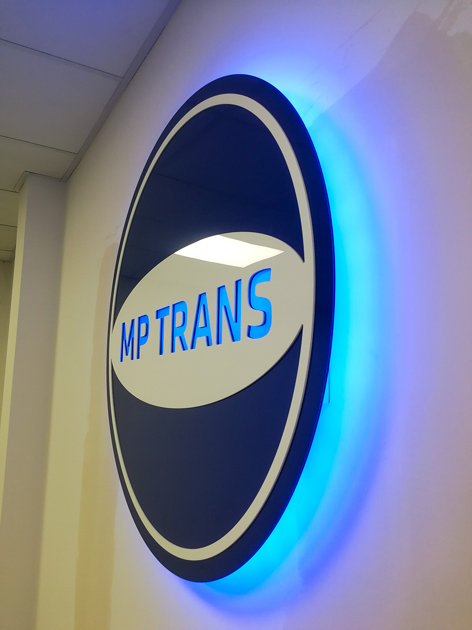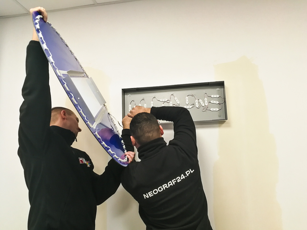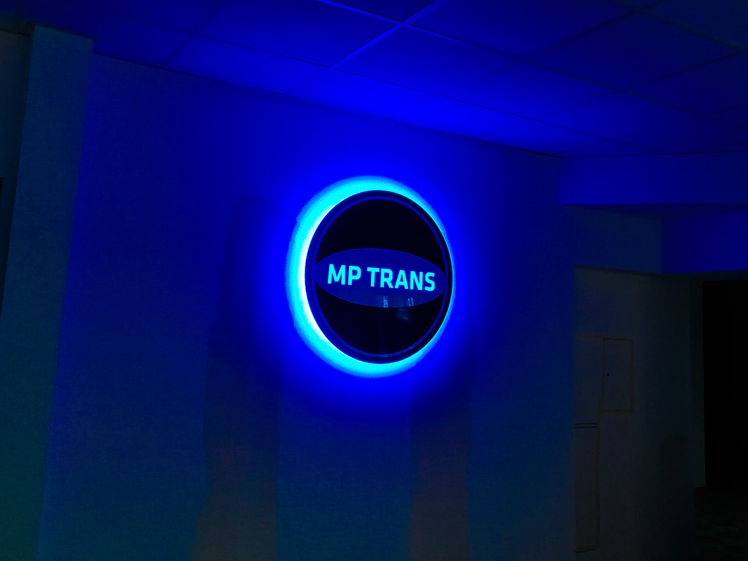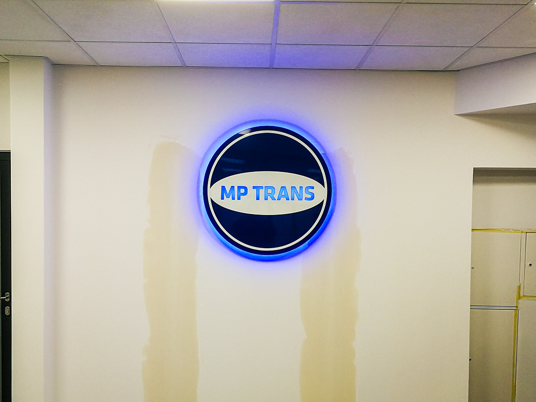 Klient oczekiwał przede wszystkim wysokiej jakości wykonania i zwracającego uwagę efektu. Logo zostało wykonane z wysokiej jakości materiałów. Niebieski dibond z błyszczącym wykończeniem oraz pełna biała plexa. Kontrastujące kolory bardzo dobrze współgrają na białej ścianie. Jako podświetlenie zostały zastosowane 2 rodzaje modułów LED. Zimno-białe - do podświetlenia napisu oraz niebieskie to utworzenia efektu HALO.