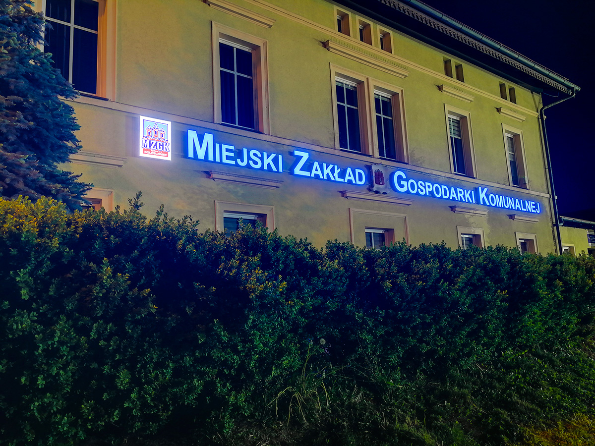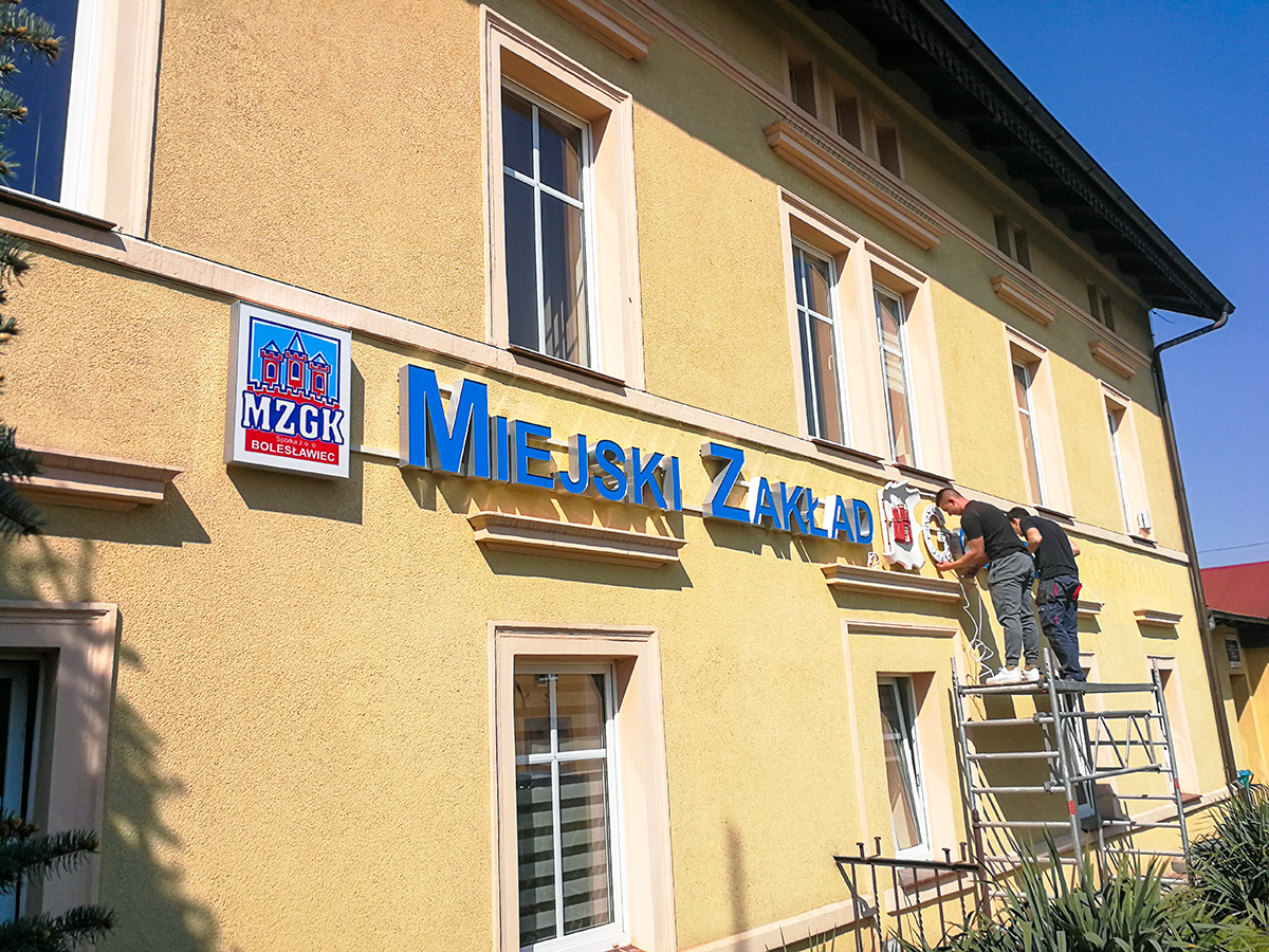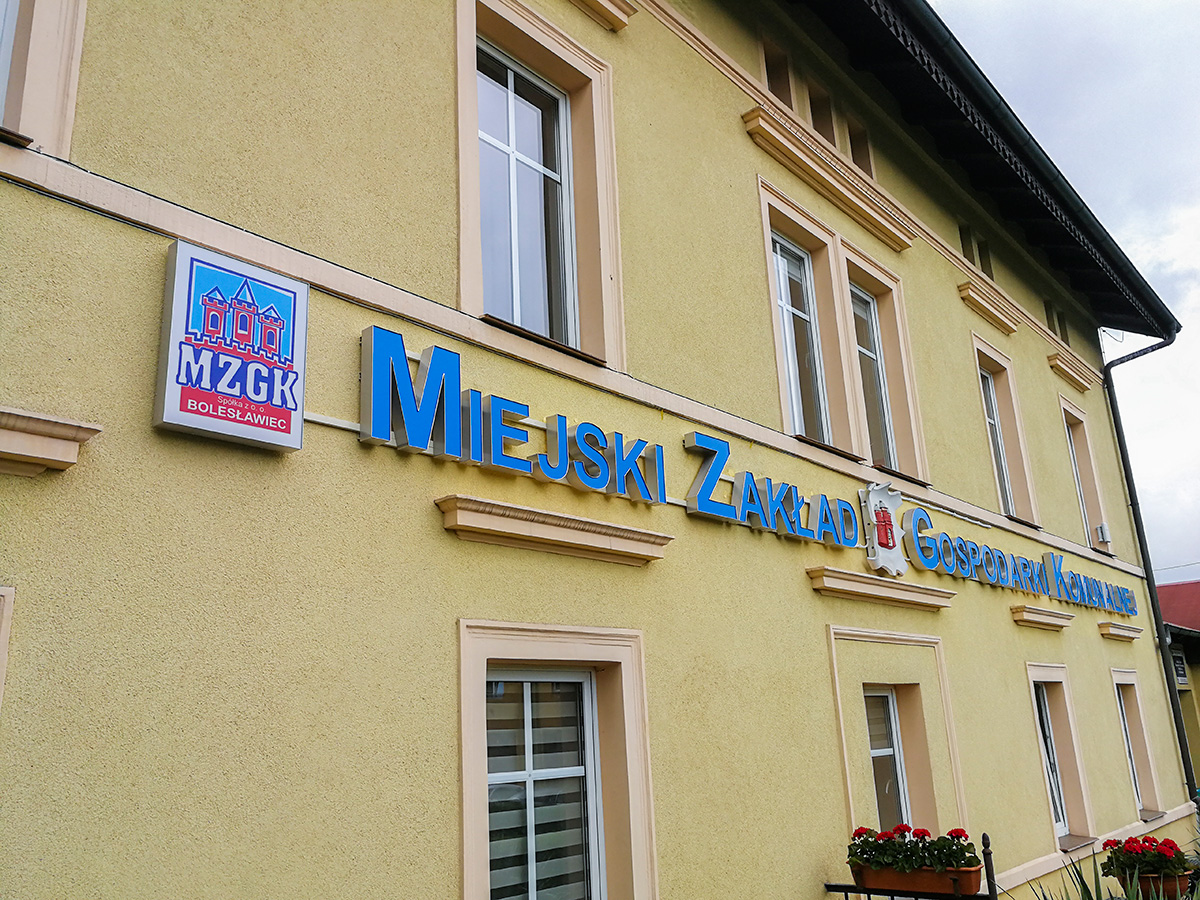 Projekt, produkcja oraz montaż podświetlanych liter blokowych na elewacji siedziby MZGK w Bolesławcu. Nowoczesna reklama zastąpiła starą i wysłużoną, wykonaną ze styroduru. Litery zostały zamontowane na konstrukcji aluminiowej, wykonanej z malowanych proszkowo profili. Kolor konstrukcji został dopasowany do barwy elewacji budynku. Reklama jest automatycznie sterowana przez czujnik zmierzchowy.