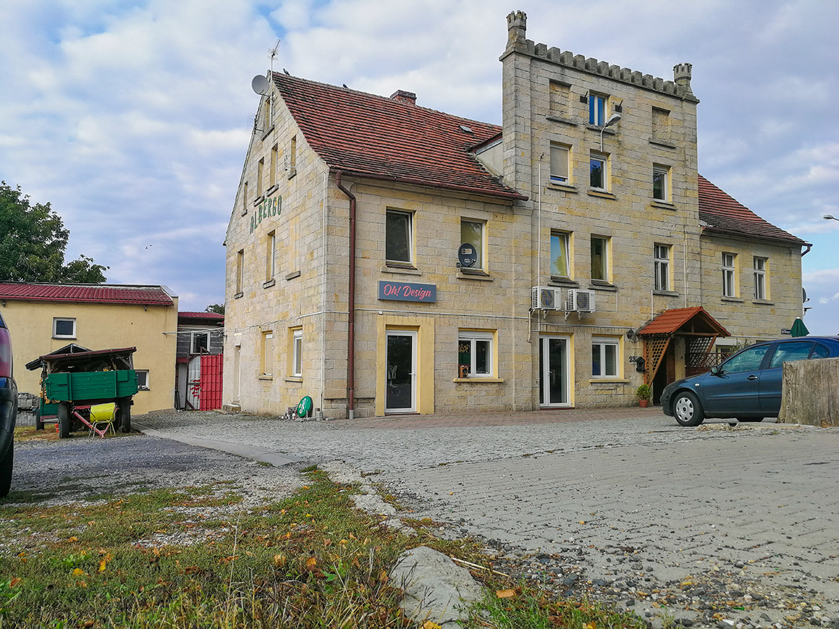 Bardzo eleganckie połączenie szczotkowanego aluminium, pudrowo-różowego koloru oraz elewacji z piaskowca. Kaseton rewelacyjnie komponuje się z elewacją.