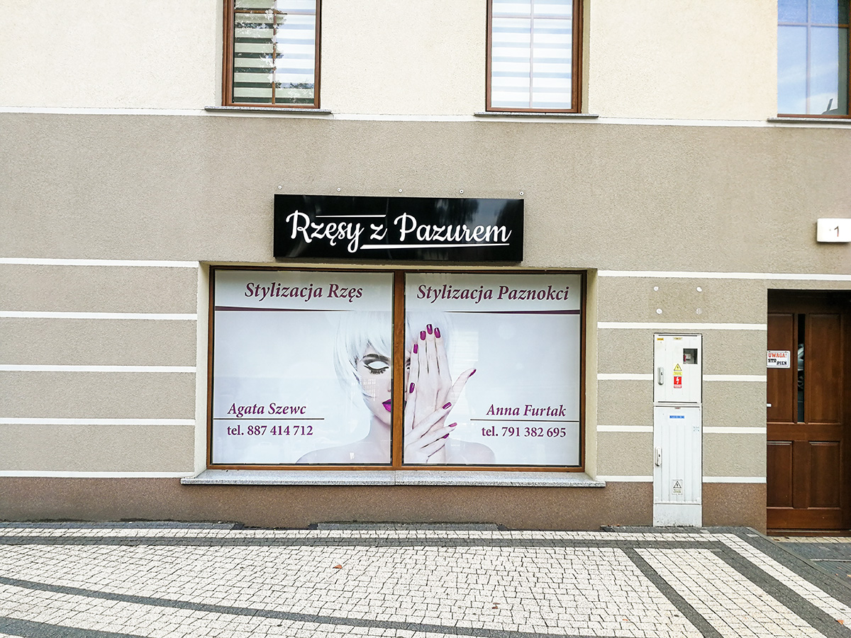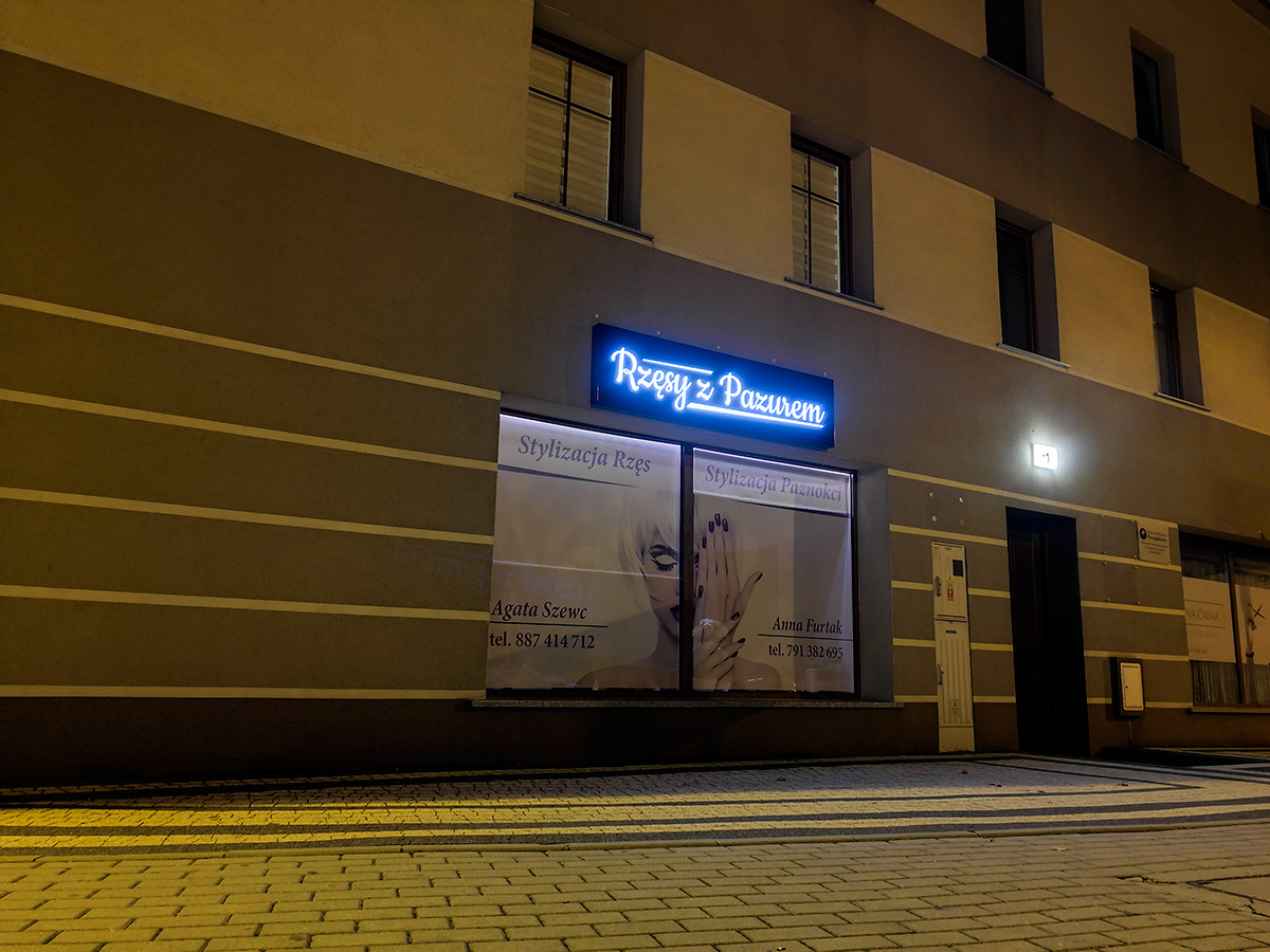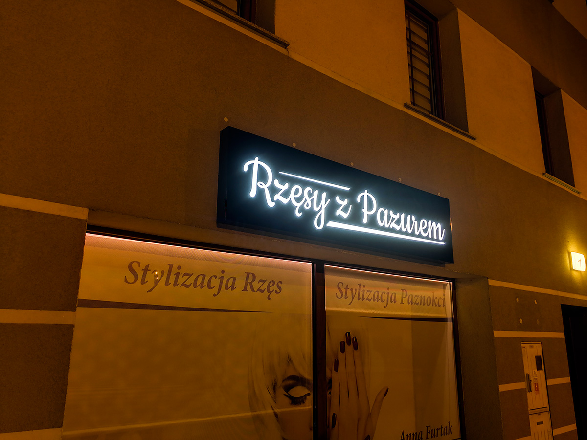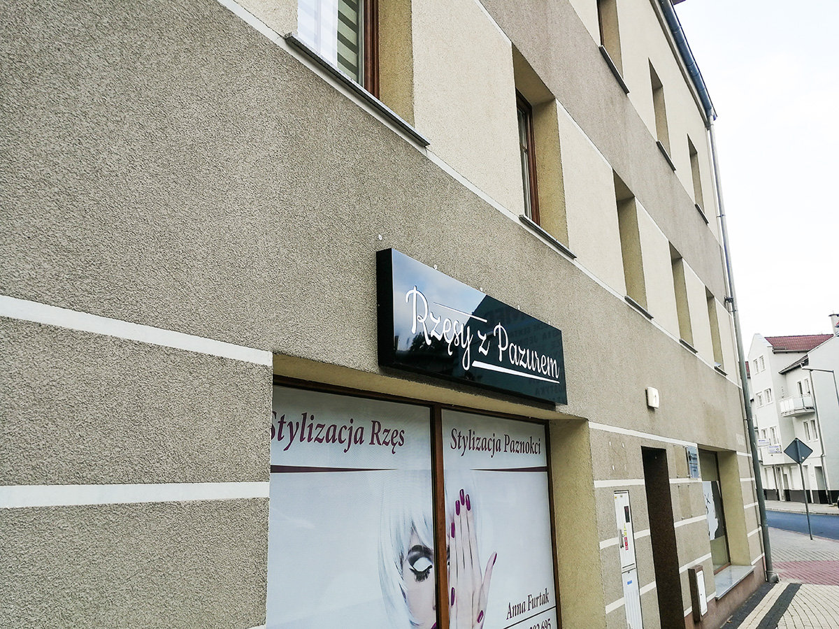 Klasyczne połączenie kolorystyczne, czarny błyszczący dibond z białym podświetlanym napisem. Reklama oddaje elegancki i profesjonalny klimat miejsca.
